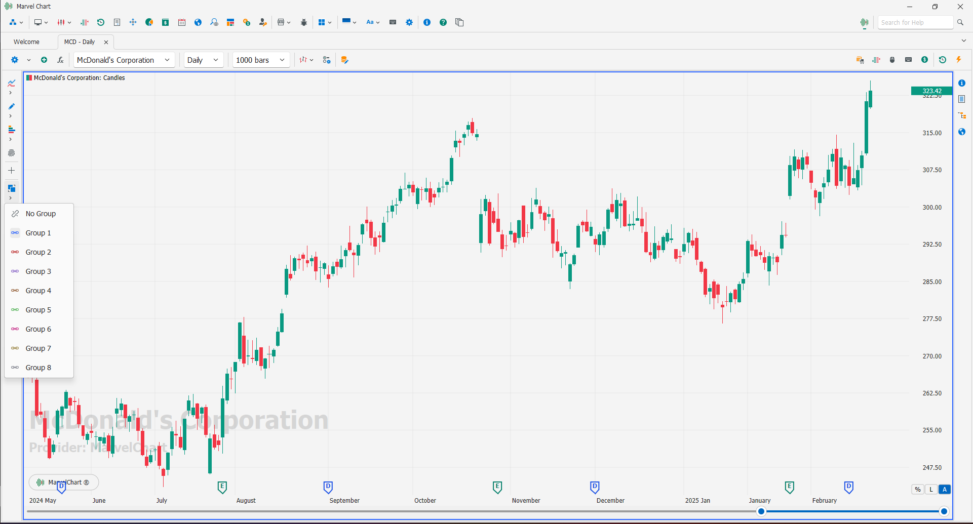 In MarvelChart è possibile collegare più Chart tra loro in modo che condividano alcune caratteristiche, come il simbolo, il time frame o gli indicatori. Per il raggruppamento dei Chart sono previsti fino ad 8 gruppi distinti, ciascuno individuato da un colore e con un insieme di impostazioni distinte dagli altri gruppi. Quando per il Chart è stato selezionato un gruppo, apparirà un bordo colorato attorno alla finestra del grafico a evidenziare la selezione effettuata.